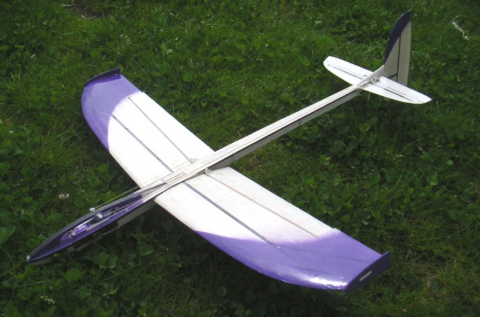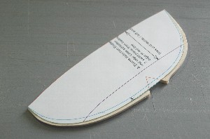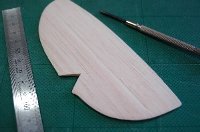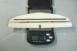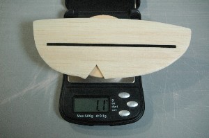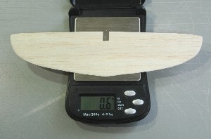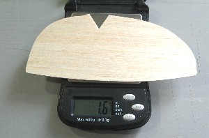 垂直尾翼はマニュアルどおり、3ミリのバルサを使用。サンディング前で1.6g |