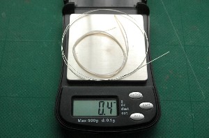 ギター弦は軽量化の為に0.014インチを使用。気になる重量ですが、 テフロンチューブとギター弦で0.4gでした。これなら良しとしましょう。