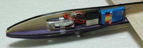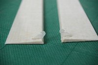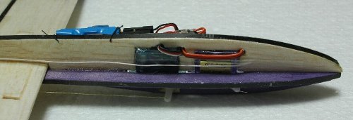 勢いで、主翼にもスパーの補強を施しました。 重量は12.8g:補強前と比べて1.2g増加。 あと、スパー補強はこの位置でよかったのか? あとから考えると、余計なことをしてしまったのではないか |