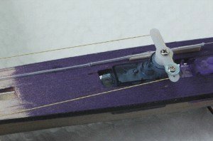 サーボホーンはSouthernX-AMで採用されている方法にしました。 ケブラー糸は左から右まで1本で行い、ワッシャをかましたビスで位置決めします。 |