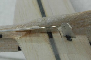 テフロンチューブは瞬間接着剤で胴体にしっかりと固定します。ホーンの手前までバルサでスロープをつくります。
