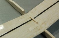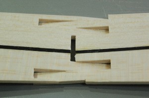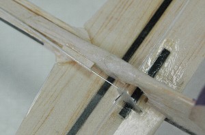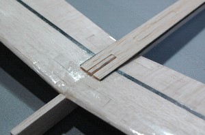 主翼の接合。5度の上半角をキープできるよう接合時の治具を兼ねながらバルサ繊維の切れ目をずらして接合強度を高めるすばらしいアイデアです。このあと、 接合部にできる穴をバルサで埋木し、ガラスクロス+瞬間接着剤で補強しました。 | |||