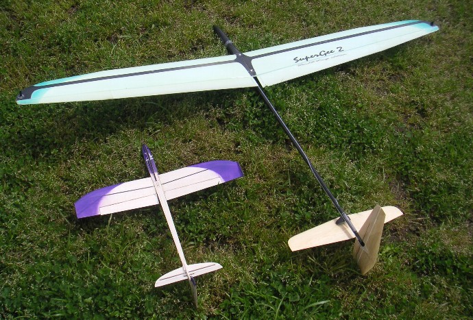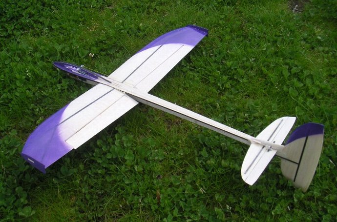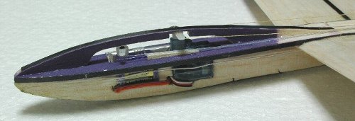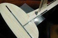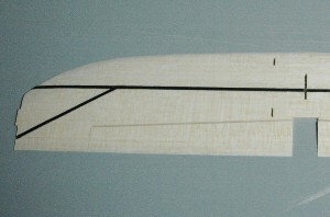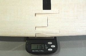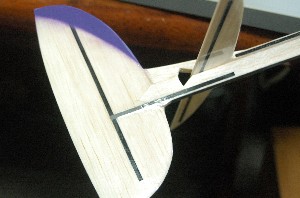 水平尾翼は比重1.4の1ミリバルサを使用。 成形の手間を省くのと、軽量化の為です。 |