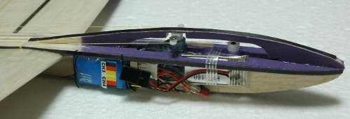 胴体の型紙を切り抜き、サーボをあてがって現物合わせします。サーボは手元にあったBLUEBIRD BMS303 コネクター含む重量は4.5g、トルク0.4kg。 型紙は3サーボ仕様ですが、重量が気になるので2サーボ仕様に。後ろが重くなるだろうと予測して前よりの2つのサーボベッドを使用することにしました。 |