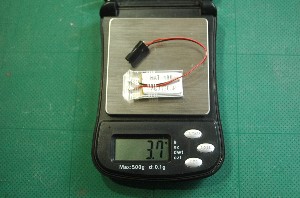 バッテリーは1セル HXT 100mAh 12-20C、16x29x3mm、3.4g (¥450) Web Shop atorie_m_mさんで購入。 |