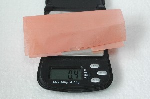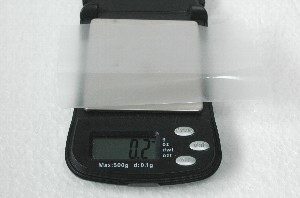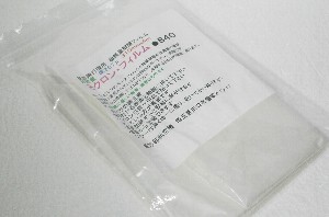 ミクロンフィルム 厚さ27μ。乳白色をしていますが加熱すると透明になります。離型紙がないのでそのまま使えて扱いやすいです。 重量は1dm2あたり0.2g。でもあまりに軽いので秤の誤差があるかも・・ |