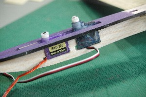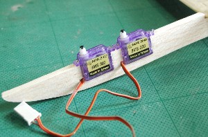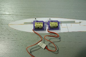 トラブル発生!ここで、受信機・バッテリーを繋いでサーボをチェックしてみると片方のサーボの動きがどうもぎこちない。 気になるので急遽、サーボを取り替えました。 |