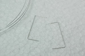 エルロンのリンケージはマニュアル通りトーションスプリング方式としました。 この方法を使用するのは初めてです。スプリングには0.011インチ=0.28ミリのギター弦を使用。(マニュアルでは0.3ミリと記載されています) 12ミリ×25ミリ×12ミリのコの字型に曲げます。 |