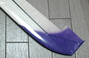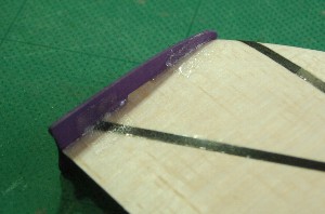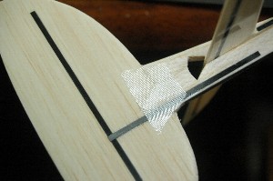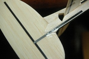 垂直尾翼は型紙どおりに材料を切出した材料を瞬間接着剤で固定します。 接合部を0.15ミリ厚のカーボンシートで補強し、その上から、ガラスクロスをあてがいます。ガラスクロスにはスプレーのり55を吹いて貼り付けるとズレがなくうまく作業できます。 |