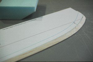 マニュアルでは6ミリバルサが指定されていましたが手に入らず、やむ終えず5ミリバルサを使用。薄翼になるので性能はかなり変わってしまうかも知れません・・ カットしたバルサを、30度のブロックで1本目のガイドラインまで削った後、10度のブロックで2本目のガイドラインまで削ります。(翼厚5ミリなのでラインは引きなおしています。) このあと、3本目のラインから後縁までサンディングした後に全体を滑らかに仕上げて完成です。 ※翼型はAG11ということでUIUCのHPよりダウンロードし、見比べましたが、どうも違うような・・ |