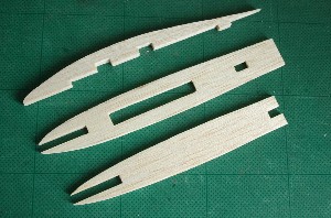 胴体の切り出し完了。マニュアルでは4ミリバルサとなっていましたが、手元になかったので縦材:5ミリ、横材3ミリのバルサを使用。この変更によりはめ合わせの穴の大きさを変えています。 マニュアルでは胴体をカーボンロービングで補強するようになっていますが、0.15ミリ厚のカーボンシートを瞬間接着剤で貼り付けました。これで十分強度が確保できます。 |