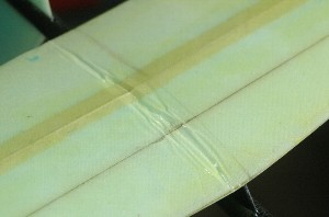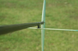 クラフトるうむカップを翌日に控えて、最後の調整。 調整も終わったところで、代投をお願いするOZ-K氏に試投をして頂きました。 最後にフルランチ・・・フラッター音と共に上昇。あわてて降ろして見ると水平尾翼が座屈していました( ̄□||||!! ※過去の経験より台座と水平尾翼の接合は念入りに行っていましたので脱落は免れました。この衝撃で水平尾翼が脱落していたら機体は大破していたでしょう。 |