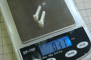 1gでも、いや0.5gでも軽くしようとM3x15ミリのレニー(三菱ガス化学、ポリアミドMXD6)製ビスを採用しましたが、予定より若干軽くなりましたのでチタンビスに変更することに。 レニー製ビスを採用した理由のもうひとつは「ヒューズ」の機能。衝撃を受けた際、ビス頭が飛んで衝撃を吸収してくれれば・・・とも思っていましたが、やはり、強度を優先することに。 |
