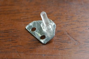機体が軽くできた一方、機体抗力に対抗する十分な推進力(重量)も必要なケースが予測されます。 いままでできなかった、「バラスト」を搭載を考えることに。 0.5ミリのアルミ板とM3ポリカーボネイトビスでこのようなパーツを作りました。重量0.35g。 |