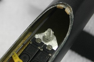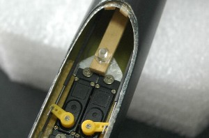 装着方法は写真の通り。スティックバラストがパイプ内の主翼パイロンのところまで届いています。 着陸時にはバラストの慣性力でサーボベッドにかなりの力が加わりますのでサーボベッドは十分に固定しておく必要があります。 |