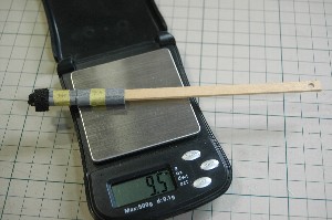 スティックバラスト。 ヒノキ棒(板)の先にスポンジを巻いて動き止め。さらに鉛板を巻いてテープ止め。 これで9.5gのバラストです。 |