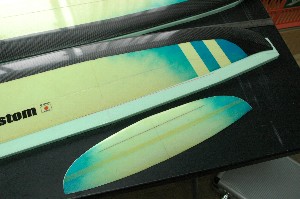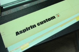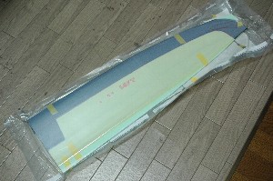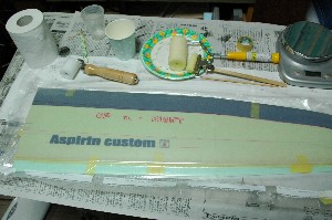 表面のバギング完了。泣いても笑ってもこれでおおかたの性能が決まります。これでもか!というくらいに樹脂を絞りました。 今回のネーミングは「アスピリン カスタム」。 今回の機体は主翼、水平尾翼はアスピリンをベースにモディファイしています。 |