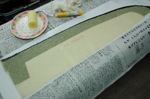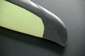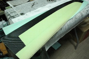 表面のクロス貼りではかなり樹脂を絞る必要があります。 やむを得ずアラミドの巾を小さくすることに。 裏面はアラミドは前縁の手前まで貼っていますが、表面ではカーボンとのラップは15ミリ程度とし、余分をカットしました。 裏表が非対称になるのであまり好ましくありませんが、苦肉の策です。これでアラミドに吸込む樹脂も含めると片面で1.5g以上は軽くなるでしょう。 |
