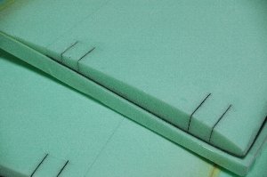 ネガティブコアでベッドをつくり、翼端をかいもので持ち上げます。 設計上半角は90ミリ、かいものの高さは92ミリにしています。 |