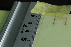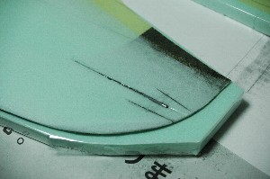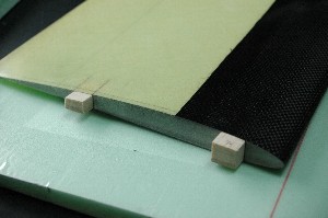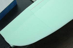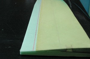 ネガティブコアでベッドを作ります。 前縁を巻き込む為にネガティブコアの前縁側を5ミリ程度カット カットする前に、後縁の部分にラインを入れておきます。前縁部をカットしたあと、コアを載せる際、このラインが目印となります。 尚、後縁のラインはテープの上から入れると、主翼に滲み出しますのでテープを貼る前に入れておきます。(前回は失敗しました) |