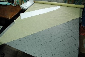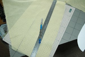 5センチのメッシュラインが入ったガイドボードの上に載せてバイアスカット。 |