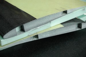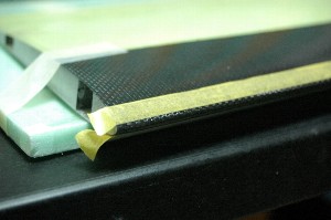 前縁の処理が飛行性能に大きく影響しますので、今まで以上に丁寧に処理することににします。 サンディングしましたが、樹脂が不足気味でしたので、マスキングをして、エポキシ樹脂を指で摺り込みます。 このあともう一度サンディングします。 |