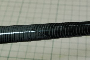 仕上がりですが、ビニールテープの重ねの部分がへこんでしまいました。サンディングしてもご覧のとおり。全体に凸凹になってしましました。 |