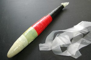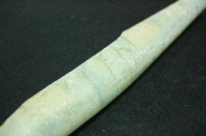 樹脂をたっぷりと塗ったあと、ゴミ用のポリ袋を短冊状に切ったものを巻きつけたあと、ビニールテープでぐるぐる巻きにします。 フードセーバーに入れてバキュームしてみましたが3次元曲面がきついのでバッグがシワシワにりました。シワが、仕上がりに悪影響を及ぼすだろうと判断し、バッグから取り出してビニールテープに変更。 バッグでバキュームするのであれば、前回のようにクリアフォルダでカバーする必要があります。 ビニールテープの色が違うのは、単に余っていた半端を使い果たしたからです。 |