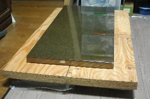翼が真直ぐになるように水平な板の上で養生します。 でも意外と水平な板はありません。 手元にあった30ミリの板も1mのアルミの角パイプを定規代わりにあててみると微妙に反っています。ごつい板は”水平”という固定観念はどうも信用できないようです。 結局、フローリングに水平な部分を見つけてそこで養生。フローリングも下地(根太)の関係で微妙に傾いたり反ったりしています。運良く部屋の端っこに水平な部分を見つけました。 |