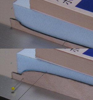 うまくいったカットの写真 カットは下面から行います。前縁部分と一番低いあたりが難所となります。 上面のテンプレートは浮きあがらないようにマチ針を1本差しました。上面のカットでは、前縁部分が難所となります。 |