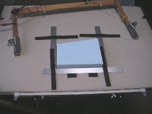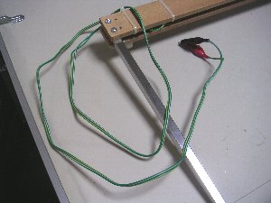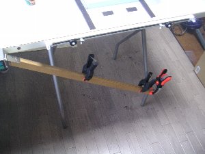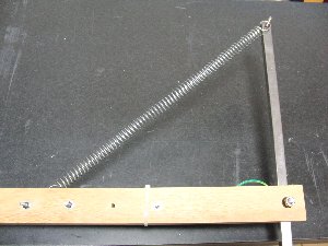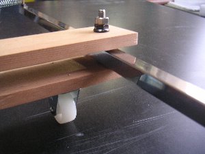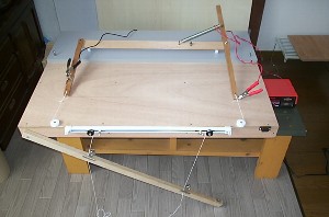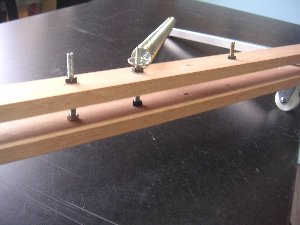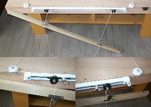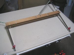 テーパー翼を作る為の差動アーム。 弓につないだ糸をアーム(木材)にクリップで止め、アーム(木材)の自重で弓を引き寄せます。 |