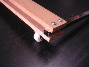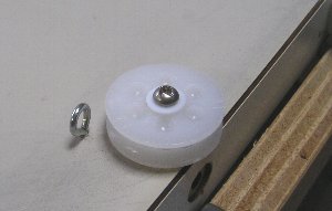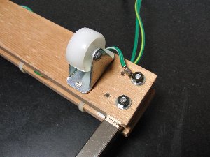 弓を引く糸を掛けるプーリー部分のディテール。プーリーは建具の戸車を分解して流用しました。 作業中に外れ易いのでヒートンを付けました。 |