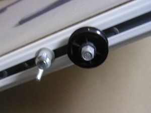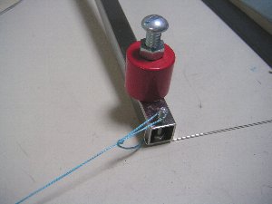 弓を引くプーリーその2。 蝶ナットを用いて任意の位置で固定できるようにしています(蝶ナットとプーリーは細長い金属プレートに取り付けてあり、カーテンレールの中をスライドできるようにしてあります。金属プレートはエンジン機のエンジンマウントを使用しました) 差動アームも以前のカッター台のものをそのまま移植しました。 |