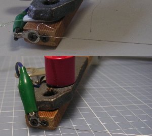 写真は弓の先端の様子:上が良くない状態、下が改善後。 ・弓の先端が浮いている→テーブルに軽く触れるくらいまで重りを載せました。 |