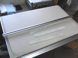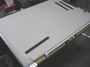 以前(5年前位)に不要となったマグネット製図台を引き取ったまま納戸に置き放しにしているのを思い出しました。表面全面がマグネットシートになっており、専用金属プレートで図面を押さえることができる構造になっています。 サイズはA1サイズ(600x900)でコアカットにはちょうどいいサイズです。 製図板の上にはスライド式平行定規がセットされています。この製図板は脚がついていないので、いつも使用している作業台の上に載せて使う事にします。 |