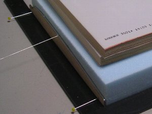 テンプレートは熱線によってずれたり持ち上がったりしますので横着をせずにピンで止めます。 ただ、この役割を果たすだけならピンの差込みは5ミリもあれば十分です。 |