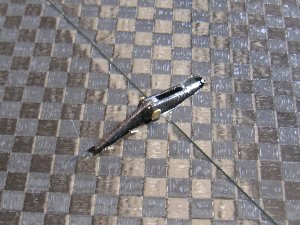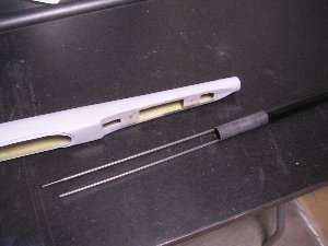 バギング前にサーボコード用の穴を一応あけてありますが、少し細いので拡張します。 以前に入手していた木工用のφ6のロングビットがありましたので電動ドリルに付けて拡大、結構うまくいきました。 この後、反対側から短いビットで穴を拡大し、φ6の貫通穴ができました。 |