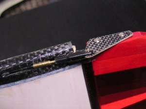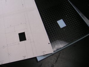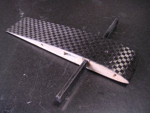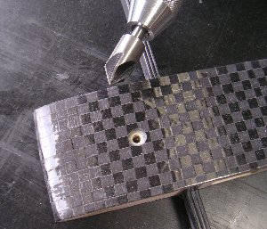 リンケージロッドの取り出し部分には大きな穴が必要です。強度的に不安がありますのでカーボンクロスで補強しました。 |