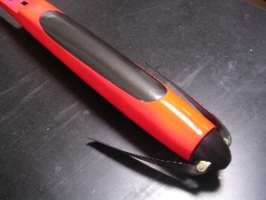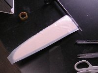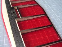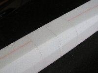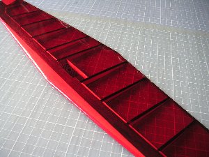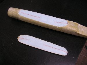 主翼を組立てる前に、可能な加工をしておきます。 翼端ピースのサーボベッド。 型紙にあわせてカットします。 |
