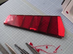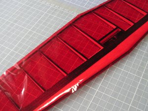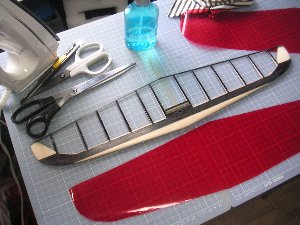 オラライトを貼ります。まずは水平尾翼から。 カーボン部分が多いので、通気がなく神経質な作業が必要となります。 |