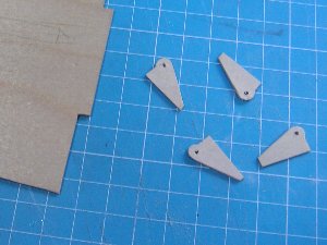 エルロン/フラップホーンは航空ベニアから切り出し。 両面にカーボンクロスを瞬間接着剤で貼り付けて補強します。 クレビスのふところは1.5mm。1.5mm航空ベニアだとカーボンクロスを貼る分、厚くなってしまったので1mm航空ベニアで作り直しました。 |