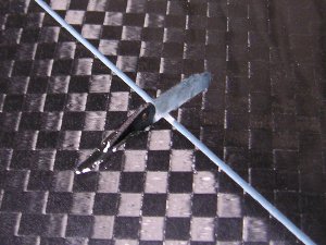 コアの成形が終わったら、クロスを貼り付けます。 2.4GHzに対応する為にアラミドで製作する事にします。まず1.7ozアラミドクロスを55スプレー使用して2プライします。 主翼台座部が複雑な形状なので、1枚で貼ろうと欲張らずに前後2枚に分けて貼り付けます。細かい部分はパッチを貼って対応。 |