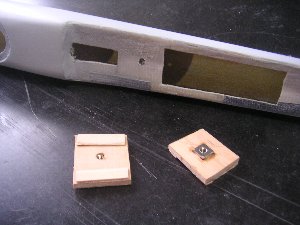 ホーンを動翼に埋め込みます。主翼本体側はサーボベッドのホーンに向かって穴をあけた後、カッターでクレビスの来る部分を削りとります。 | ||