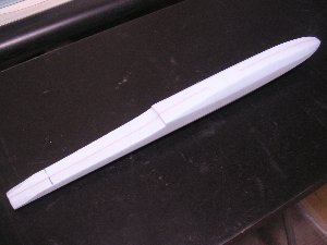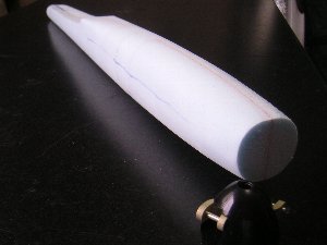 #180、#240のサンドペーパーでスムーズな曲面に成形します。 スピンナーに合わせて先端をカットします。この時点でモーター面のダウンスラストをを付けておきます。(少し大きすぎたか?と思いながらも製作続行) これでコアの準備完了! |