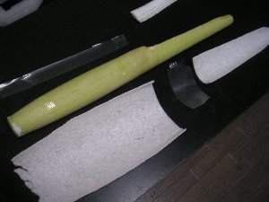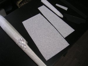 樹脂硬化時の3次元曲面をうまく養生する方法がないかと考え、手元にあった3D機の機体製作用の30倍発泡のEPPを使用してみました。 予め30倍発泡のEPPをPODに沿うようにカットしておきます。EPPをグルッと巻いた際に重ねが出るとそこが浮いてしまいます。少し短めにしておきます。短くて足らない部分には予めPPのクリアファイルを帯状に挟み込んで浮きを防止します。 5052樹脂を塗った後にEPPを巻いてその上から梱包用のストレッチフィルムでグルグル巻きにします。 |