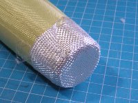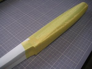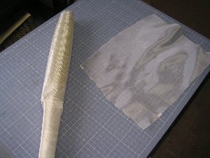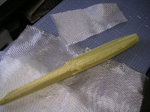 1.7ozアラミドと200g/m2ガラスクロスを張り終わったら最後にマイクログラスで巻き込みます。先に貼った200g/m2ガラスクロスは腰が強く、エポキシ樹脂を塗った際にほどけてくることがありますが、マイクログラスで巻き込んでおけば防止できます。 |