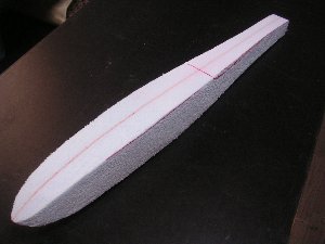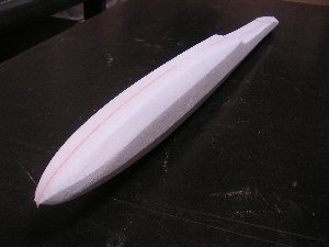 PODはロストコア方式で製作します。30ミリのスタイロフォームだと2枚張り合わせる必要があります。 2枚のコアを接着する際、接着面にカラースプレーを塗っておくことでセンターラインができますので加工の目安になります。(堀内師匠伝)これがないとシンメトリーな削り出しは難しいです。 荒削りしました。考えて作ったつもりですが、長さが足りない。デザインバランスも悪い (・・,*) |