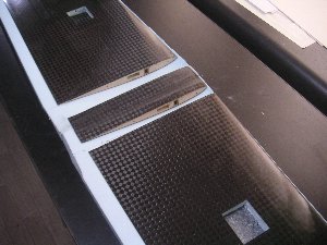 続いて200g/m2ガラスクロスを2プライします。200g/m2ガラスクロスは腰が強いので端部には55ではなく77スプレーを使用します。 |