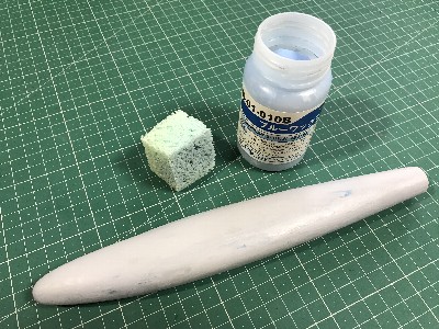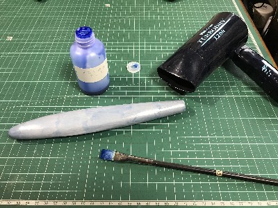 続いてPVAを塗ります。PVAはワックスで弾かれますのでドライヤーで乾かしながら塗り込みます。 PVAは洗濯のりの成分と同じですので洗濯のりで代用できると思います。しかし、最近は洗濯のりというものを売っているのか? このPVA、買ったばかりだとWAXで弾いてしまって結構塗りにくいです。写真のボトルは10年近く前に買ったもので、水分が抜けて、いい具合に濃縮されていて塗りやすくなりました。 |