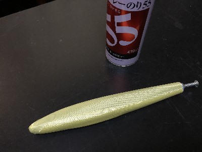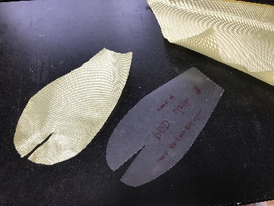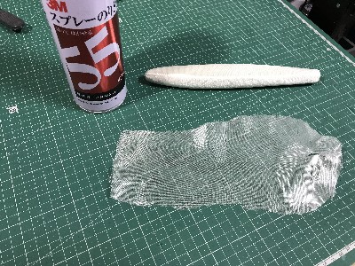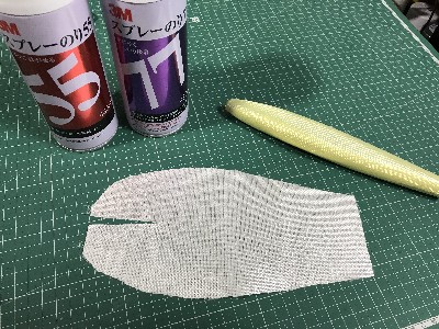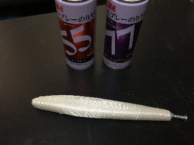 1層目:アラミドクロス1.7oz 写真のように、クリアファイルなどでクロス切り出し用のテンプレートを作っておくと便利です。2センチ程度重なるように型取りします。 1.7ozがない場合は1.0ozアラミド1.0oz2層でも代用できます。スプレーのり55で予め2層に積層することにより、取り扱いが楽になります。 スプレーのり55を1.7ozアラミドに吹き付けて雄型に巻きつけます。シワにならないように注意深く伸ばしながら貼り付けます。 |